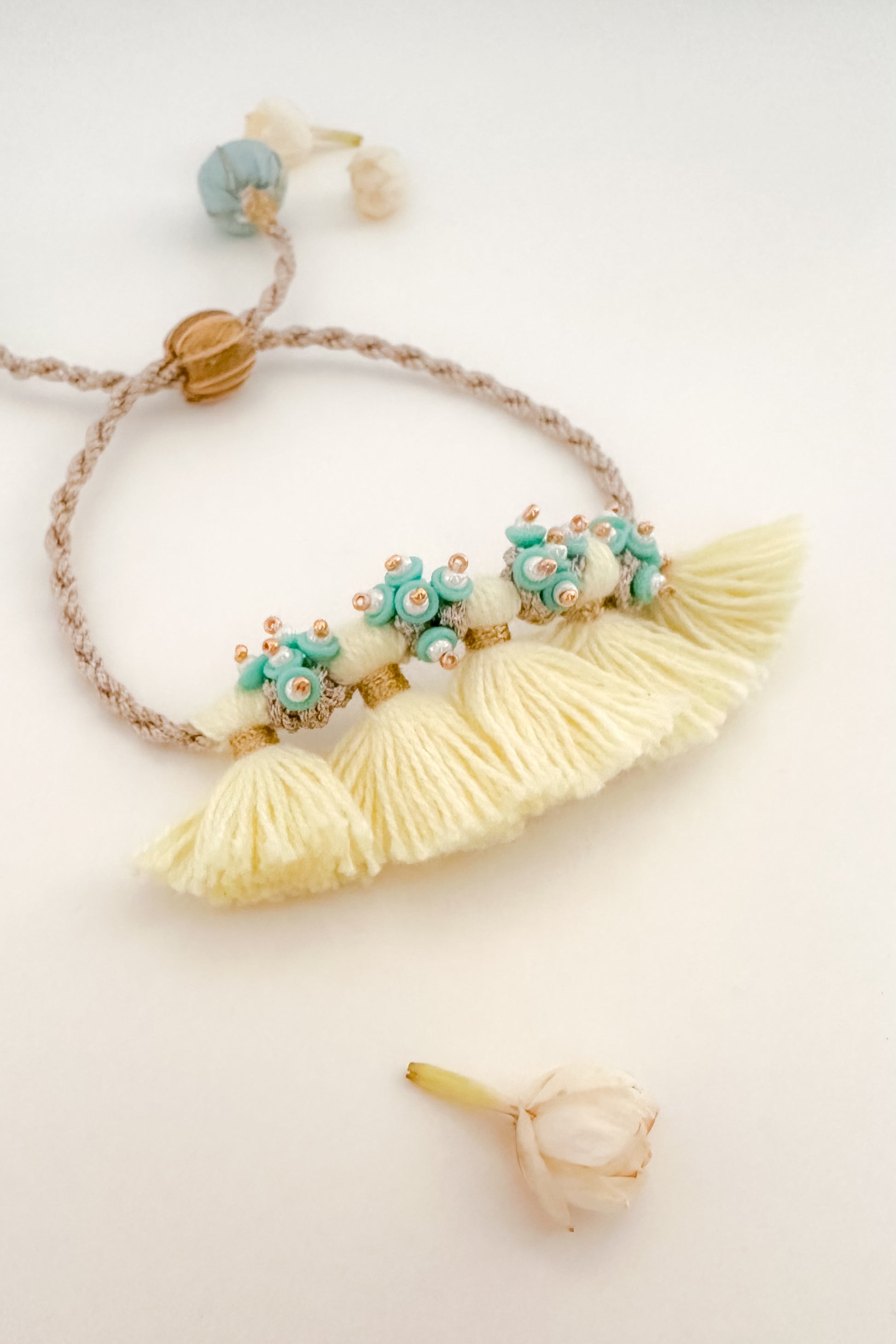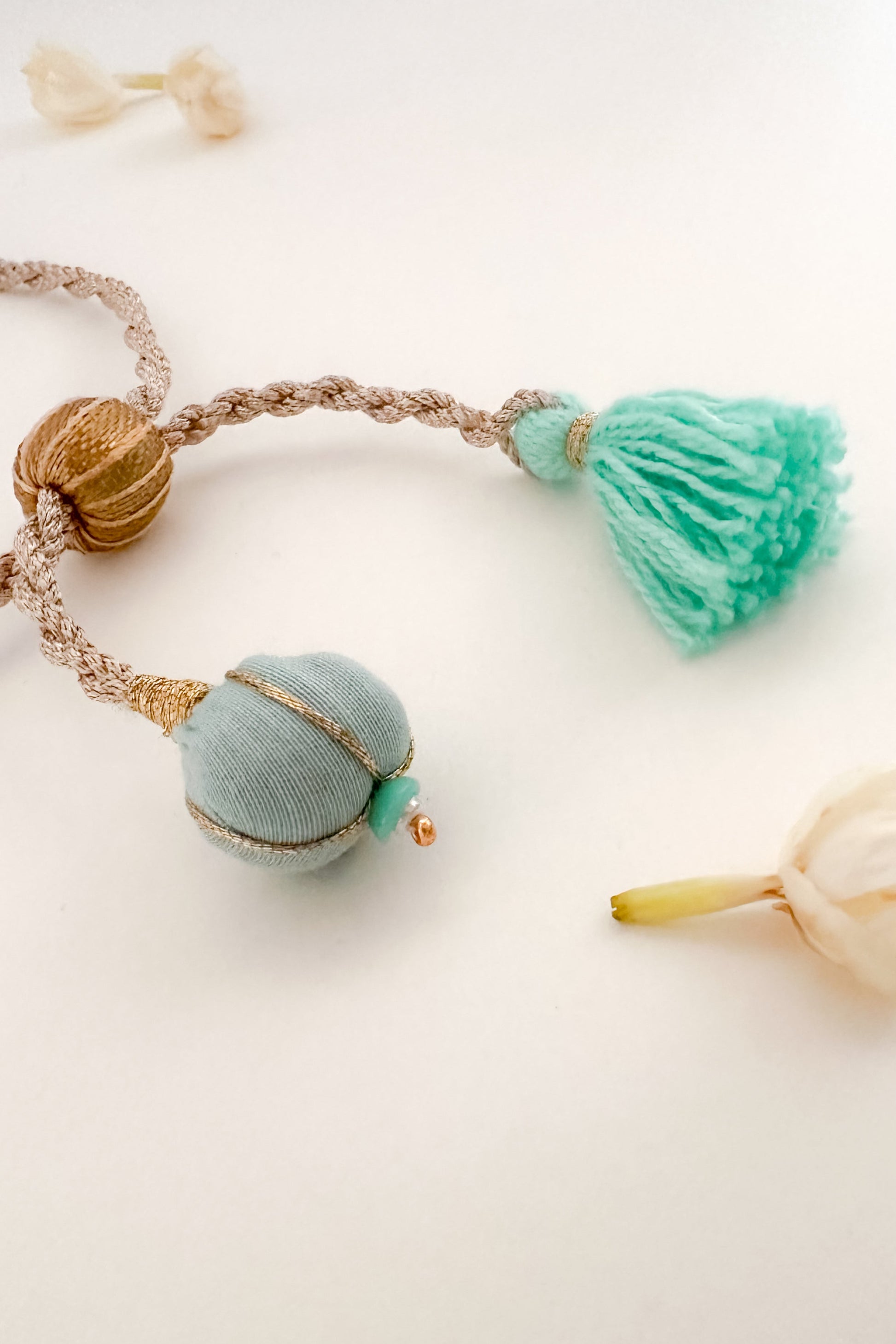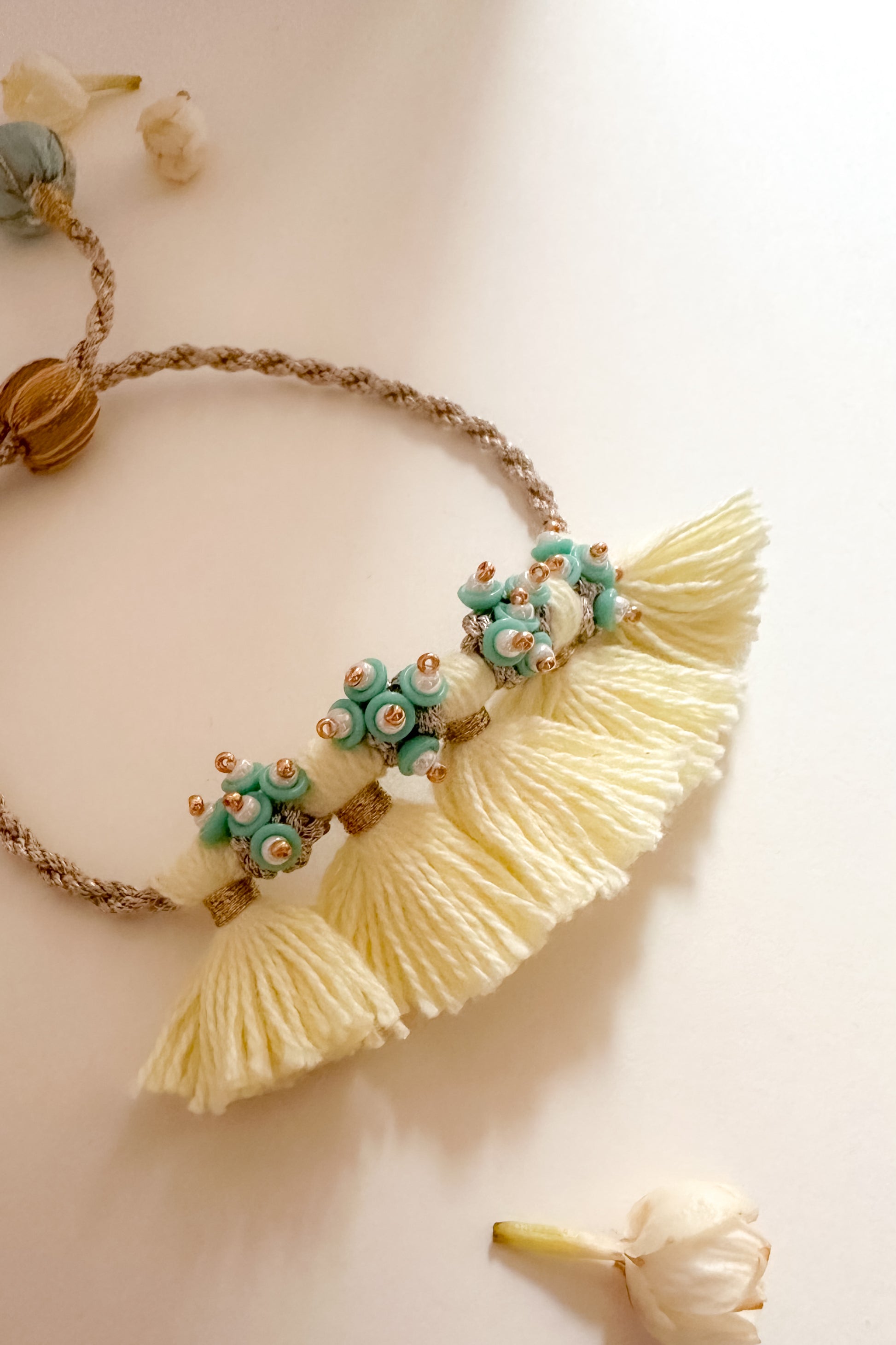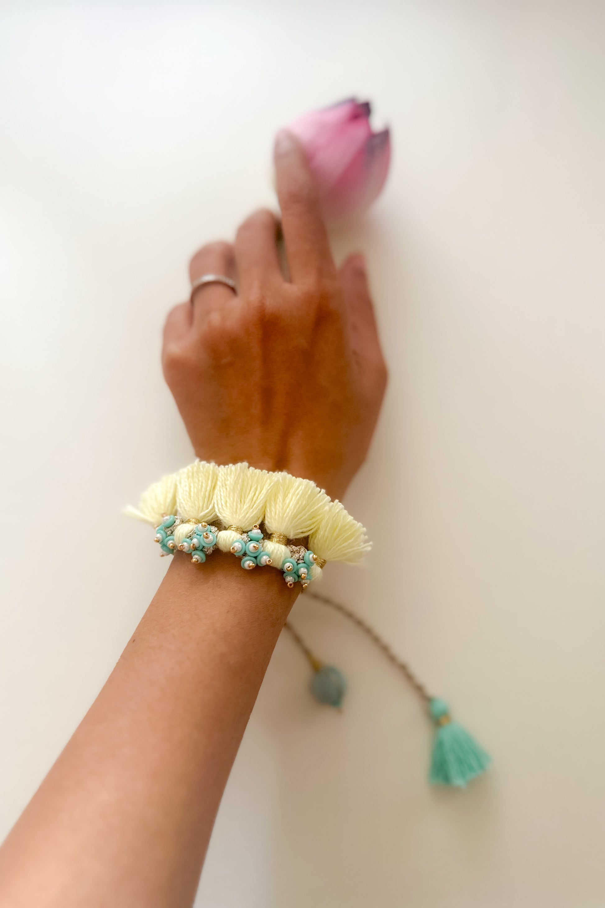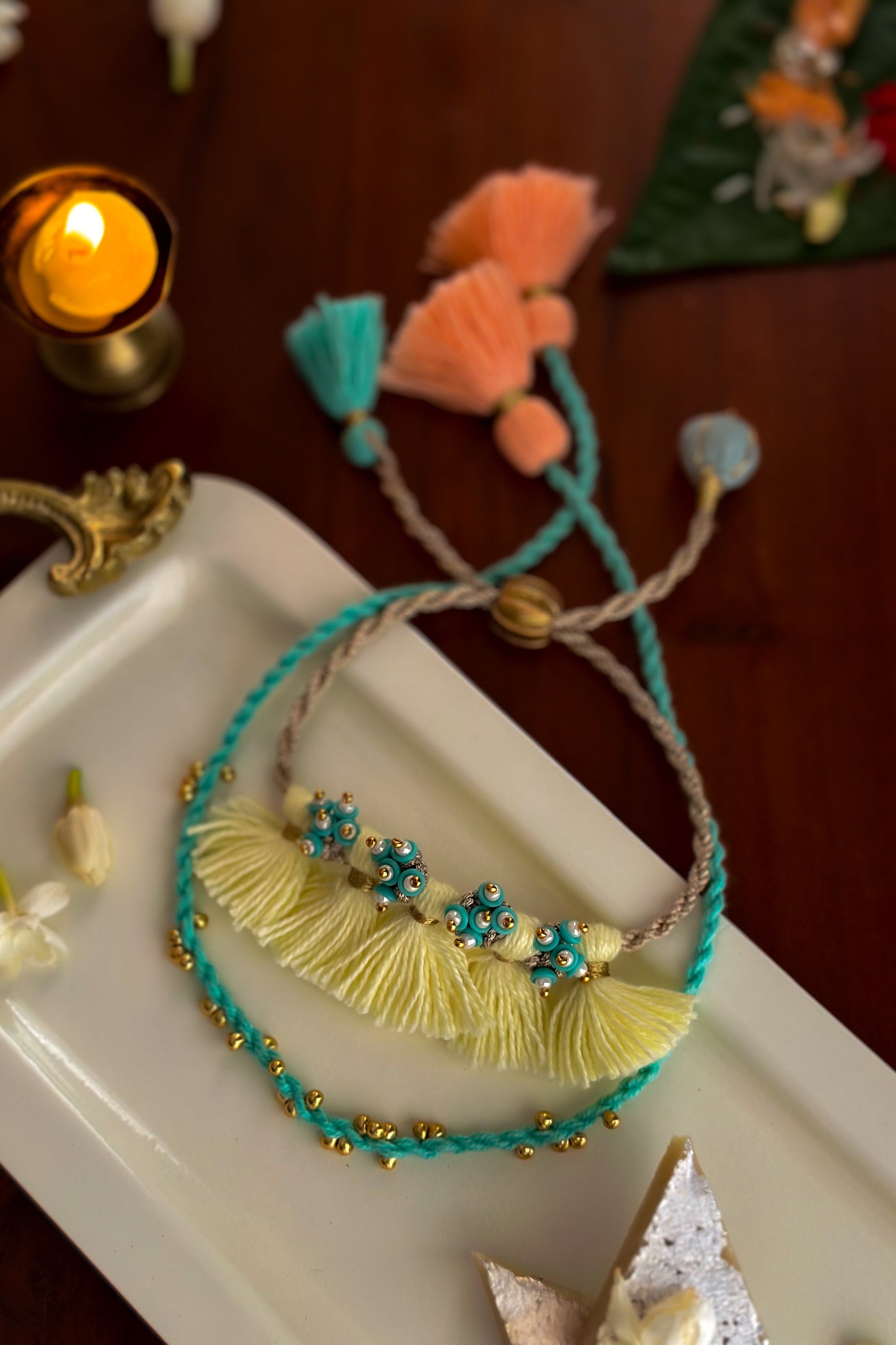 Inspired by the golden blooms of the Amaltas tree, this lemon yellow Rakhi with teal accents brings a burst of freshness to the festivities. Handcrafted with soft tassels, delicate beadwork, and playful textures, it’s a vibrant piece that doubles up as a festive bracelet—perfect for Rakhi or your Haldi & Sangeet look. A cheerful ode to handmade traditions with a modern spirit.