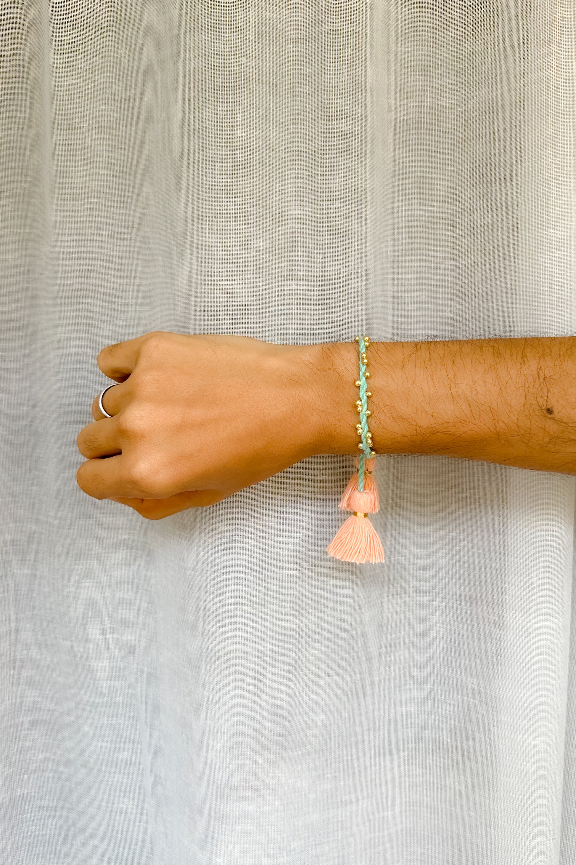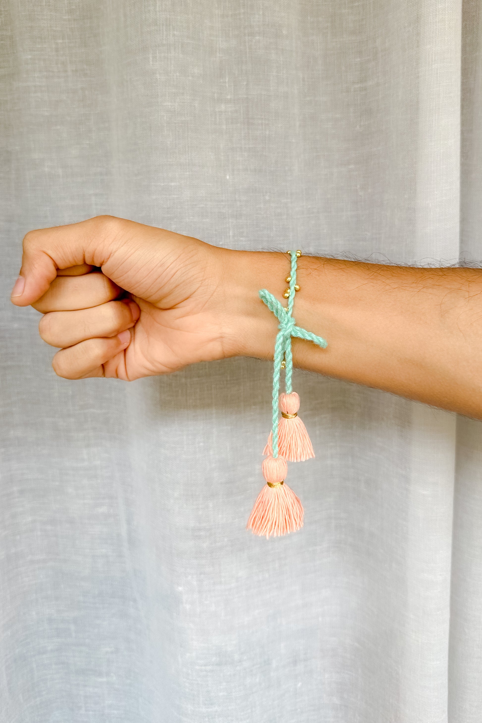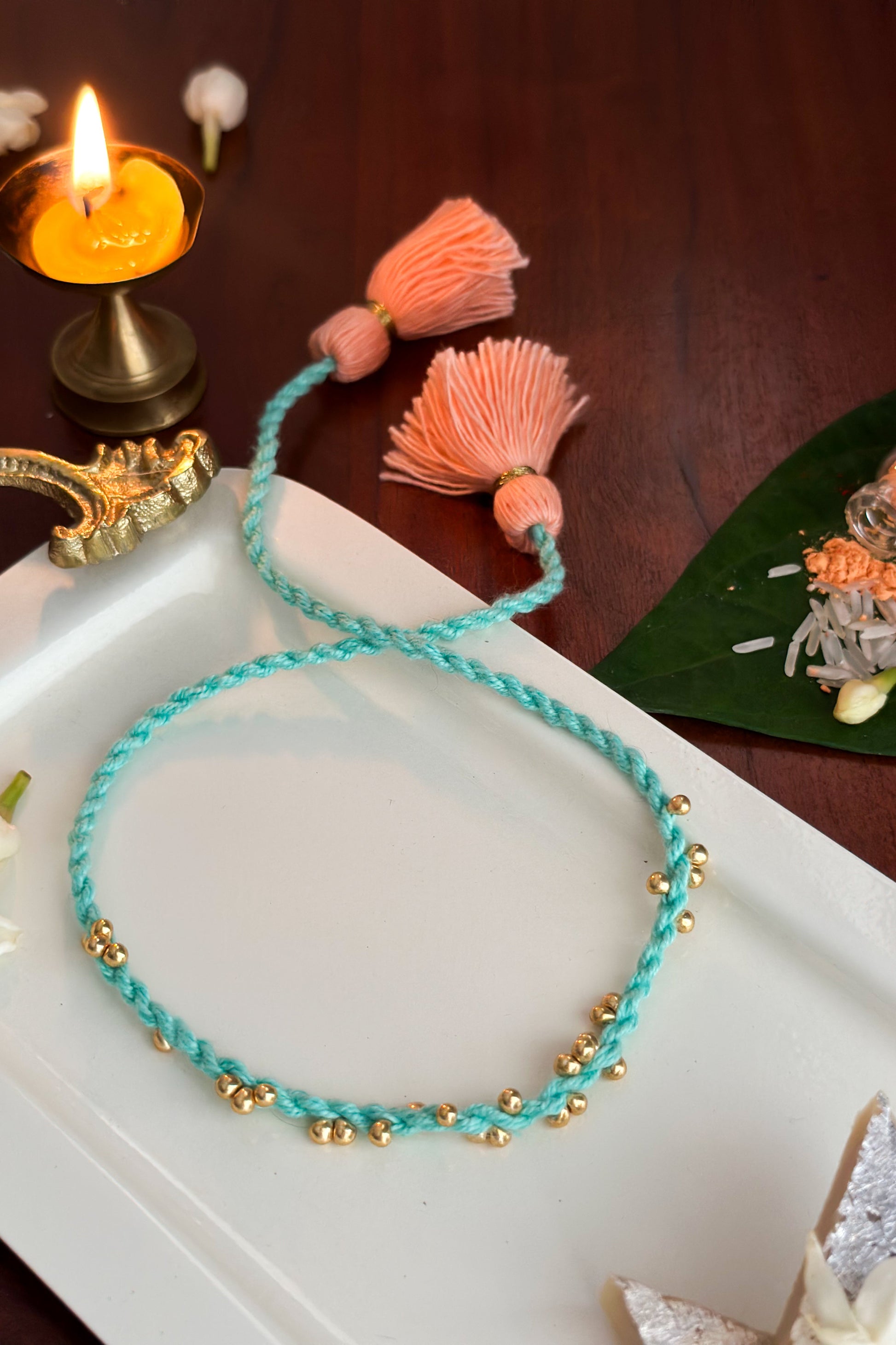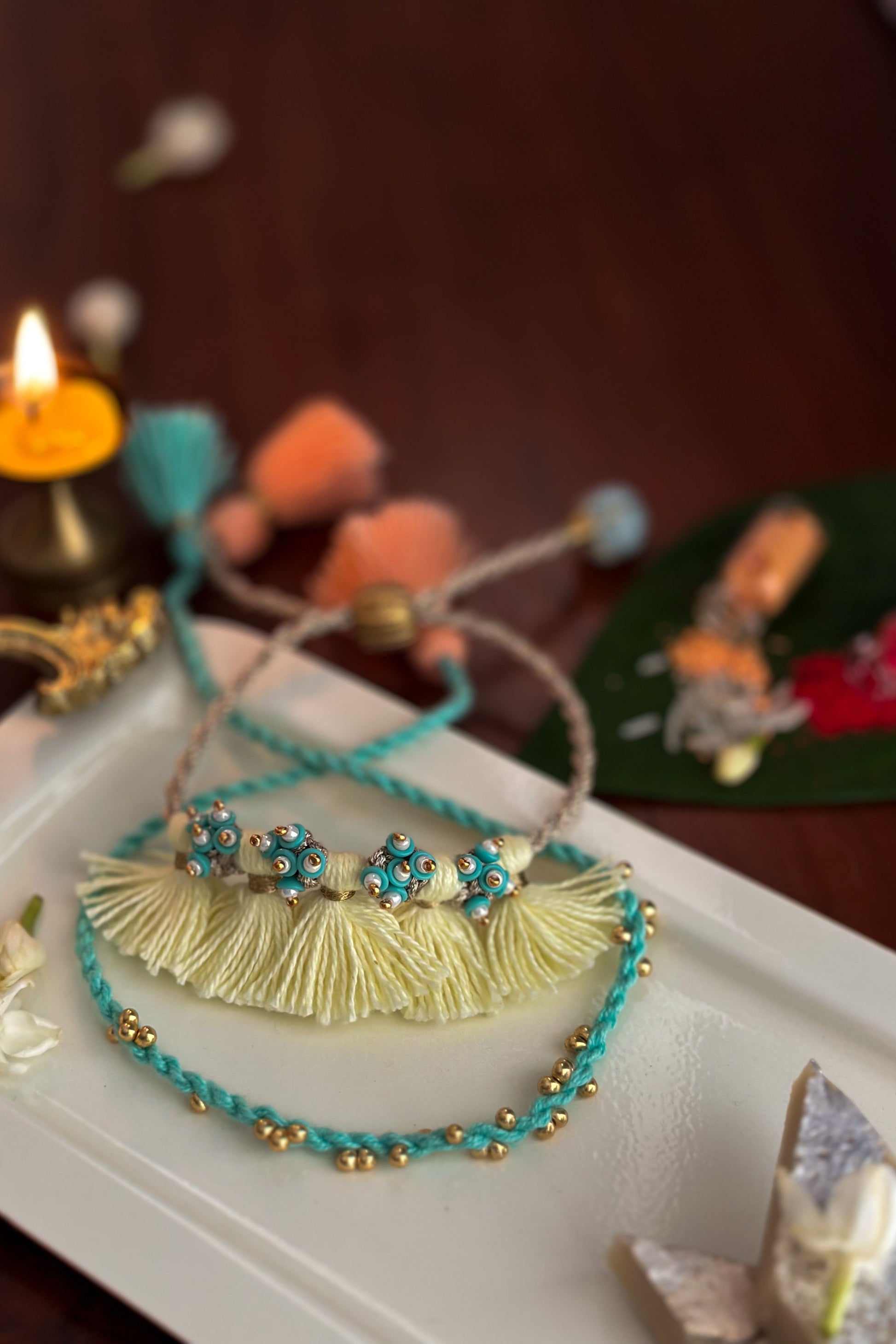 A thread of simplicity and joy. The Ferozi Dor is a twisted teal blue rakhi adorned with dainty gold-toned beads and finished with soft peach tassels. Light, festive, and playful — it’s a celebration of sibling love in its most effortless form.