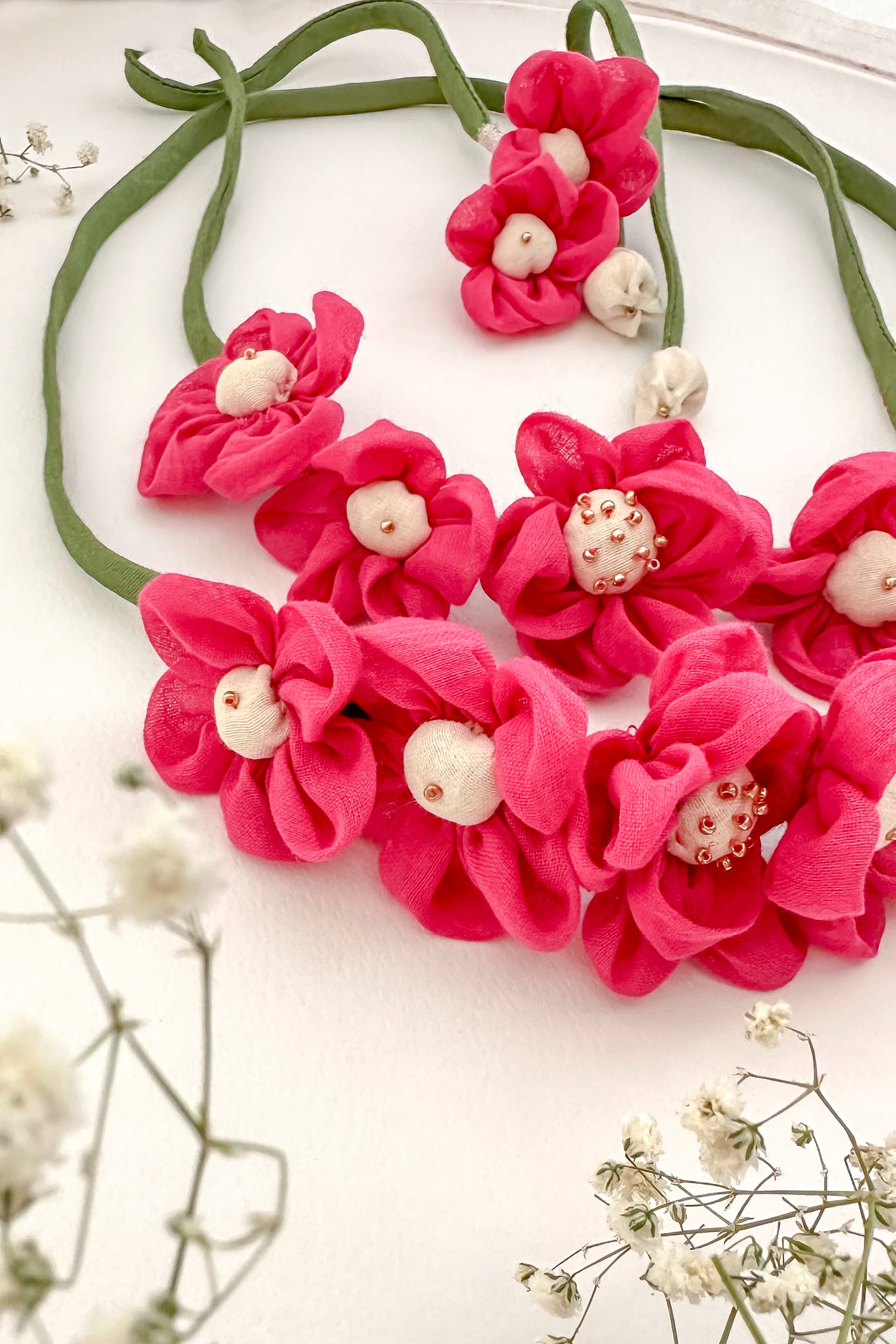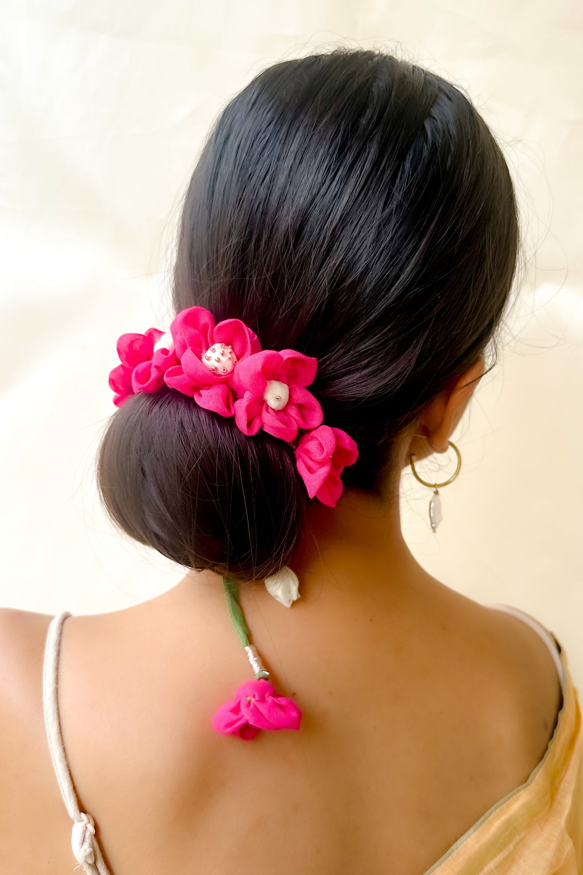 Gulabi Gajra is a simple and delicate take on the traditional gajra worn by Indian women — reimagined in a rich, dark pink hue. A perfect blend of charm and grace, this hair adornment adds a soft floral touch to any look.