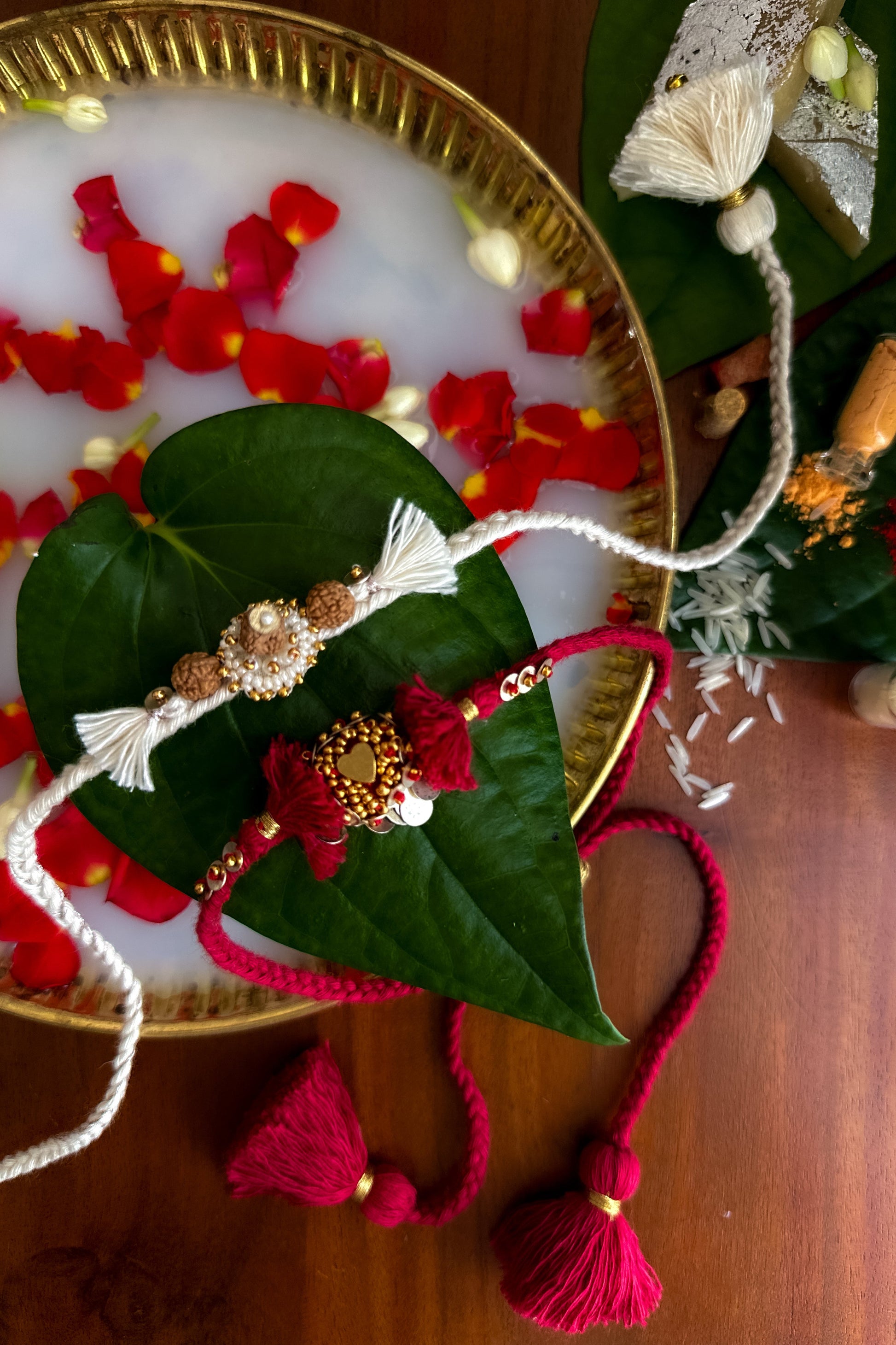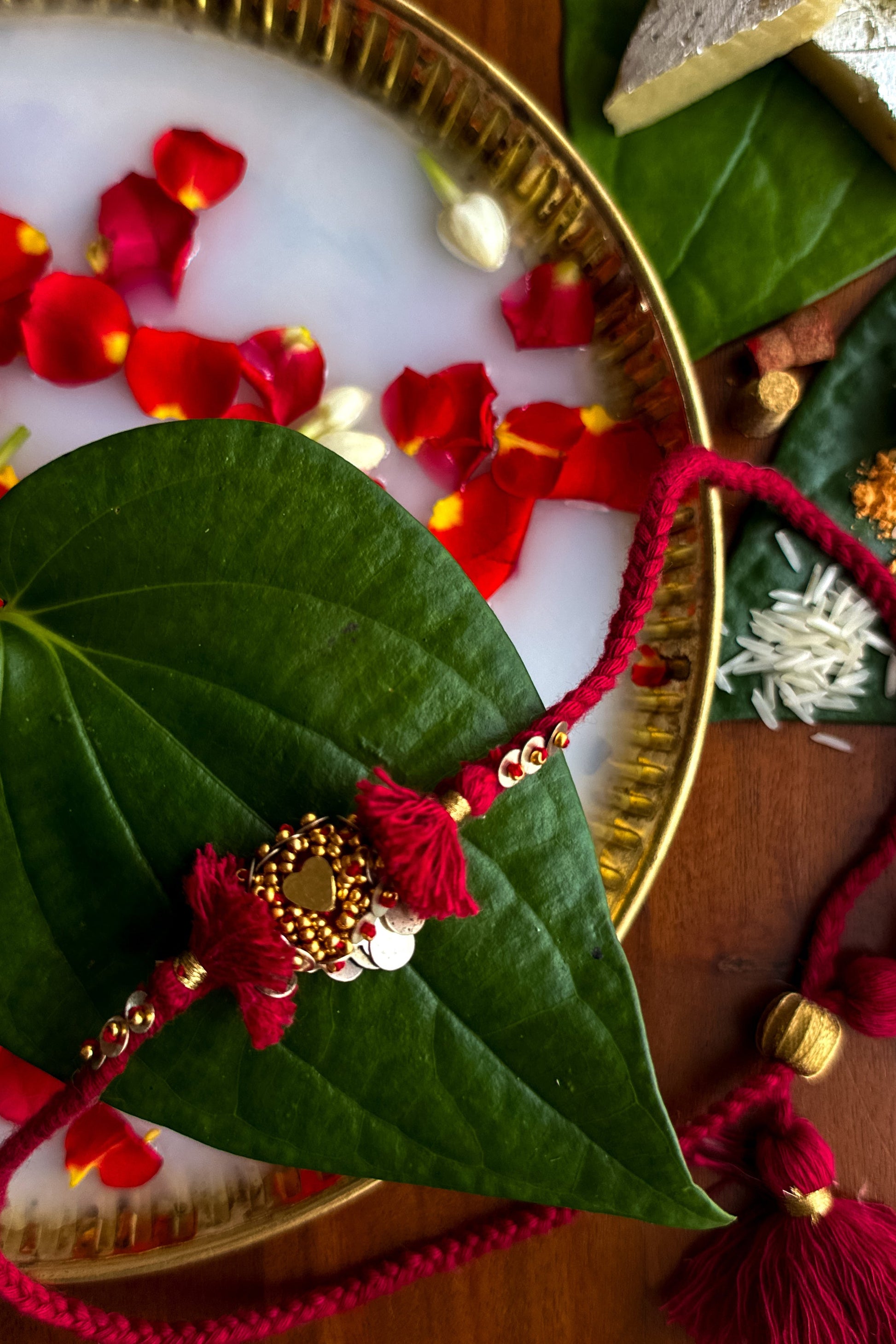 Bold, festive, and full of warmth — the Lali Rakhi is handcrafted in rich red threads with gold beadwork, sequins, and playful tassels.