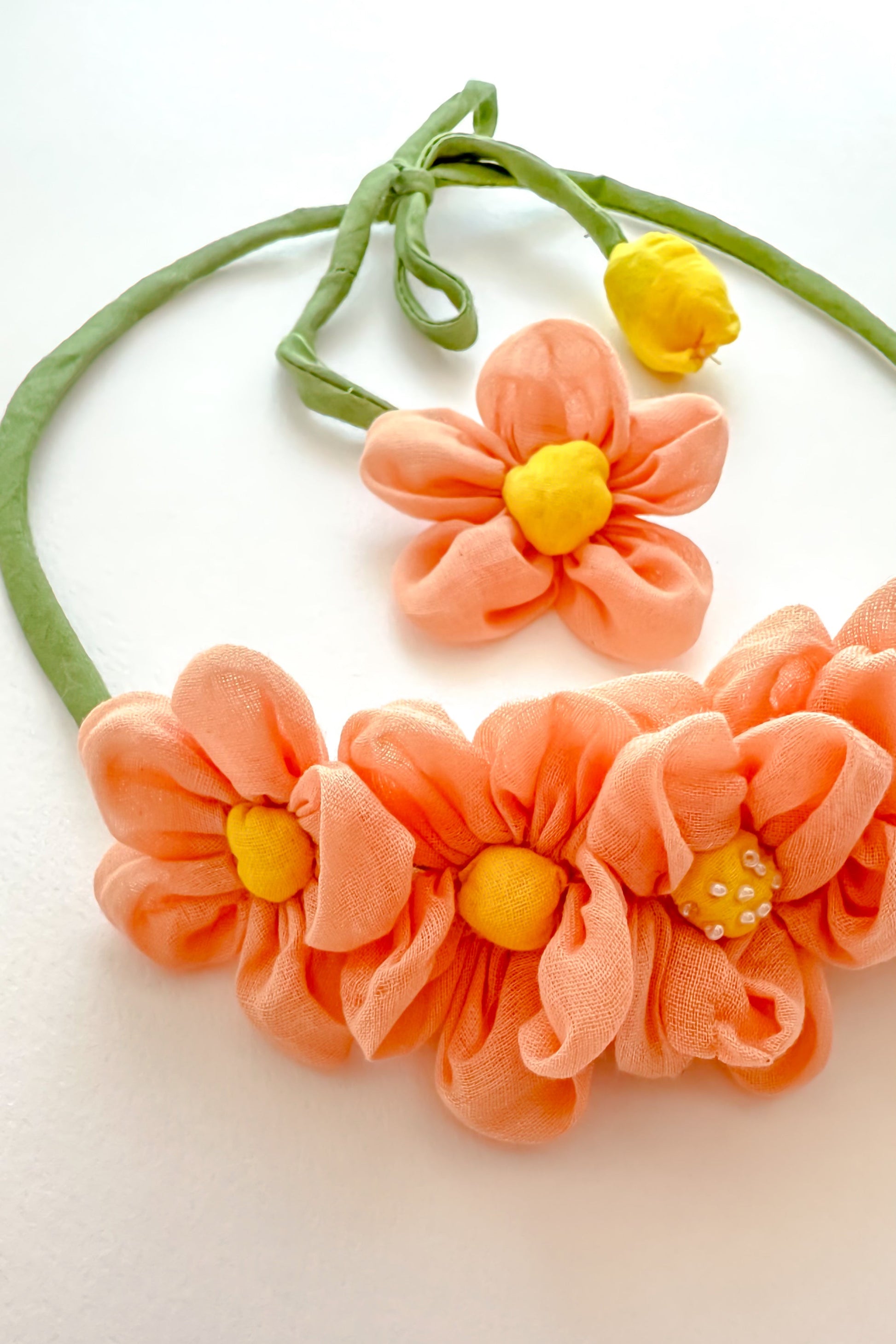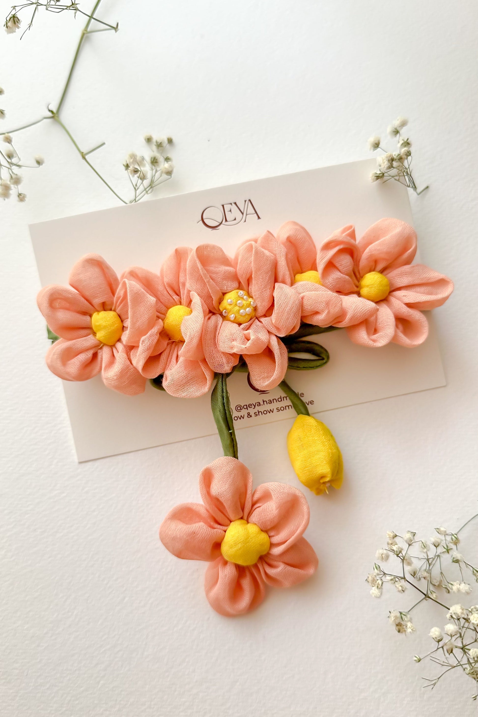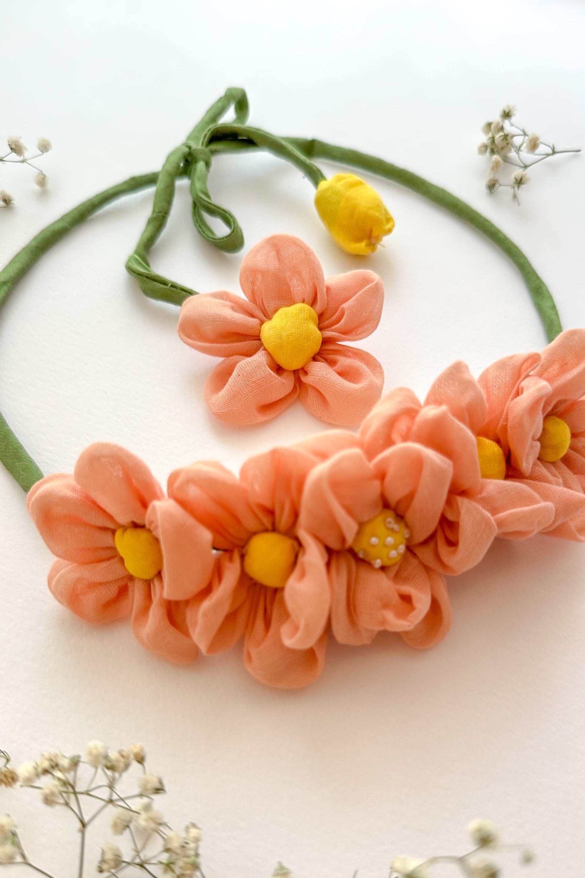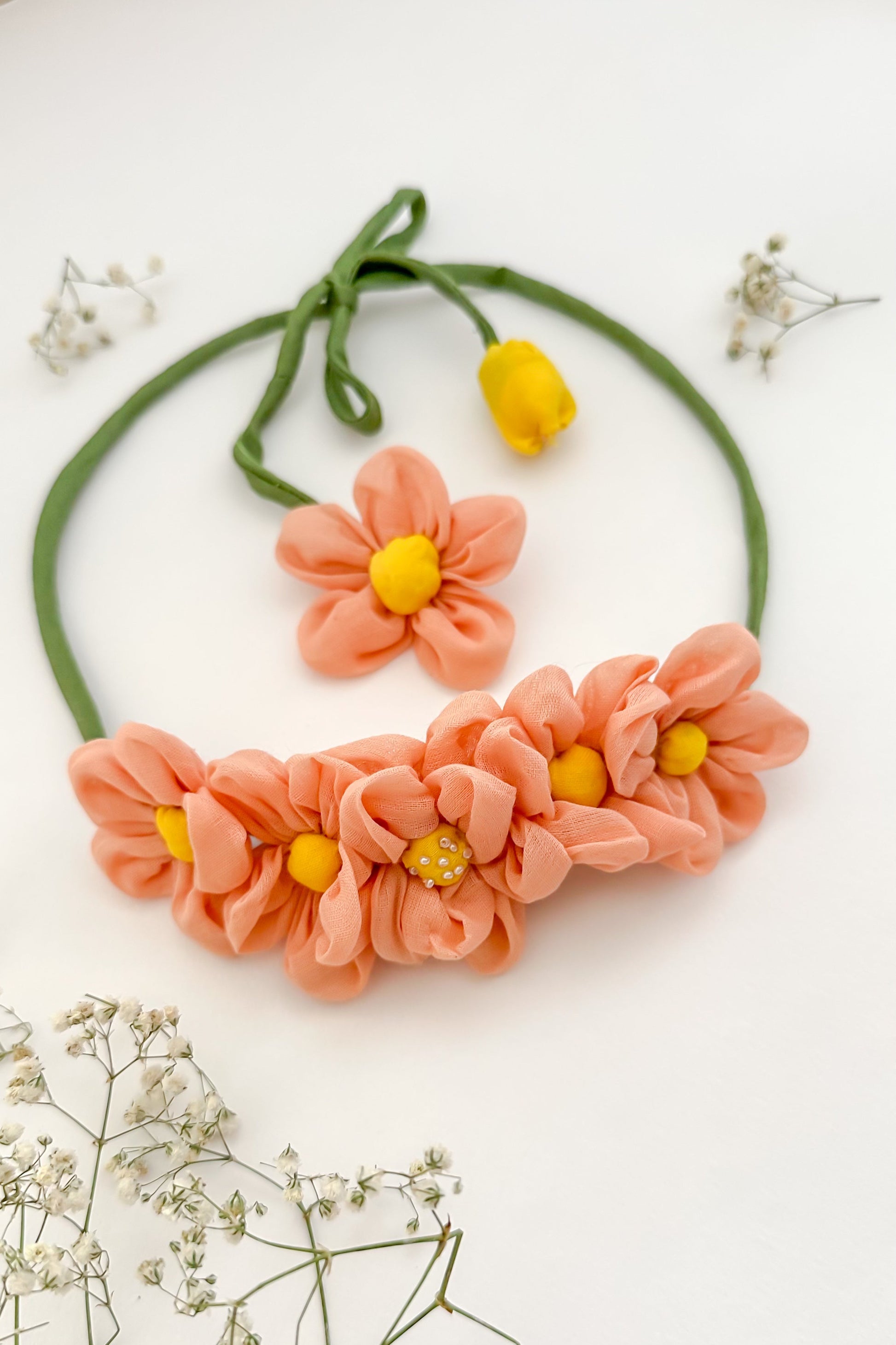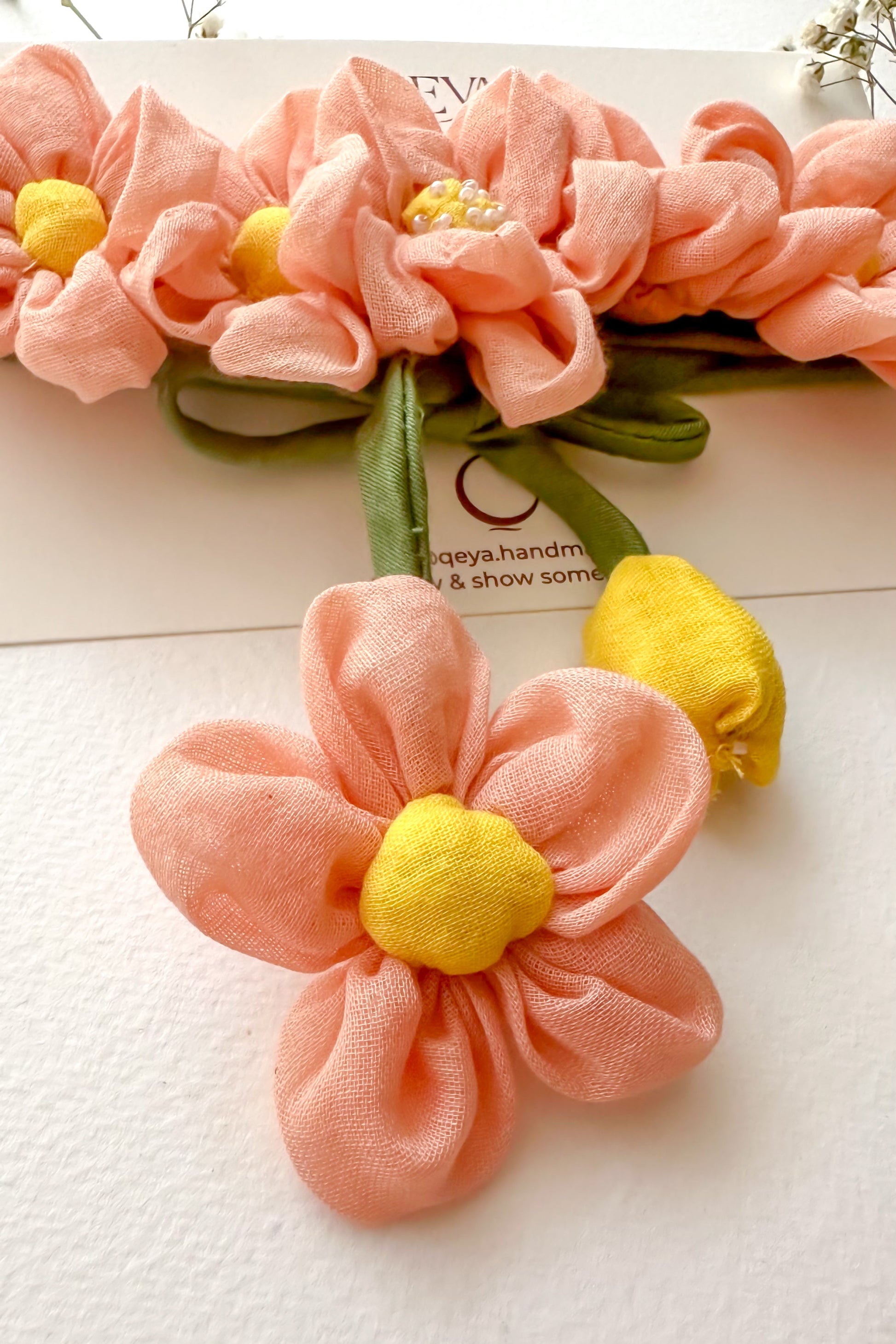Manjari Gajra is a delicate and elegant hair accessory that brings a fresh twist to the traditional Indian gajra. Handcrafted in a soothing peach and yellow palette, this floral gajra evokes the soft charm of blooming blossoms — perfect for festive wear, haldi ceremonies, or everyday elegance.
