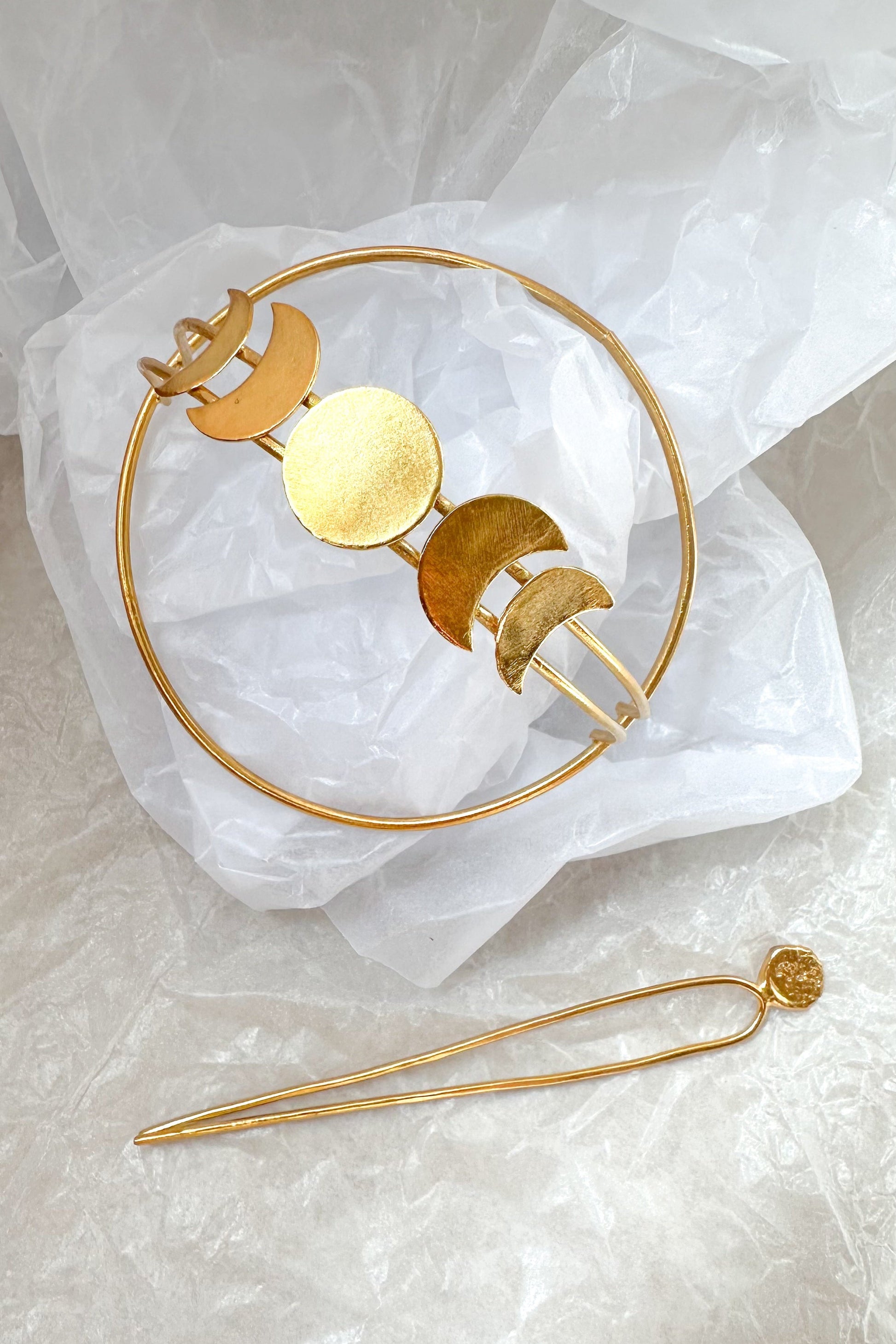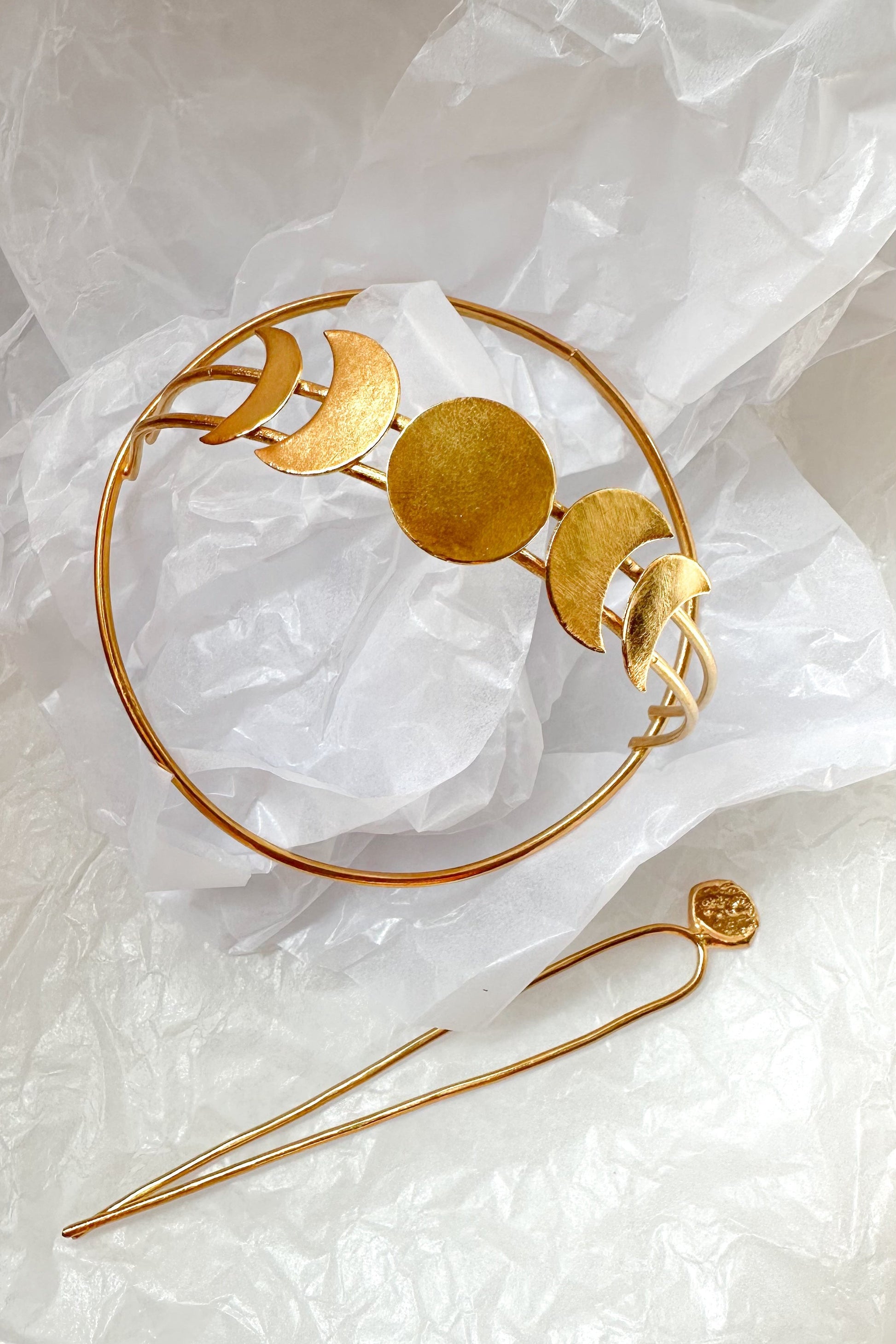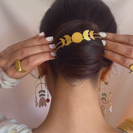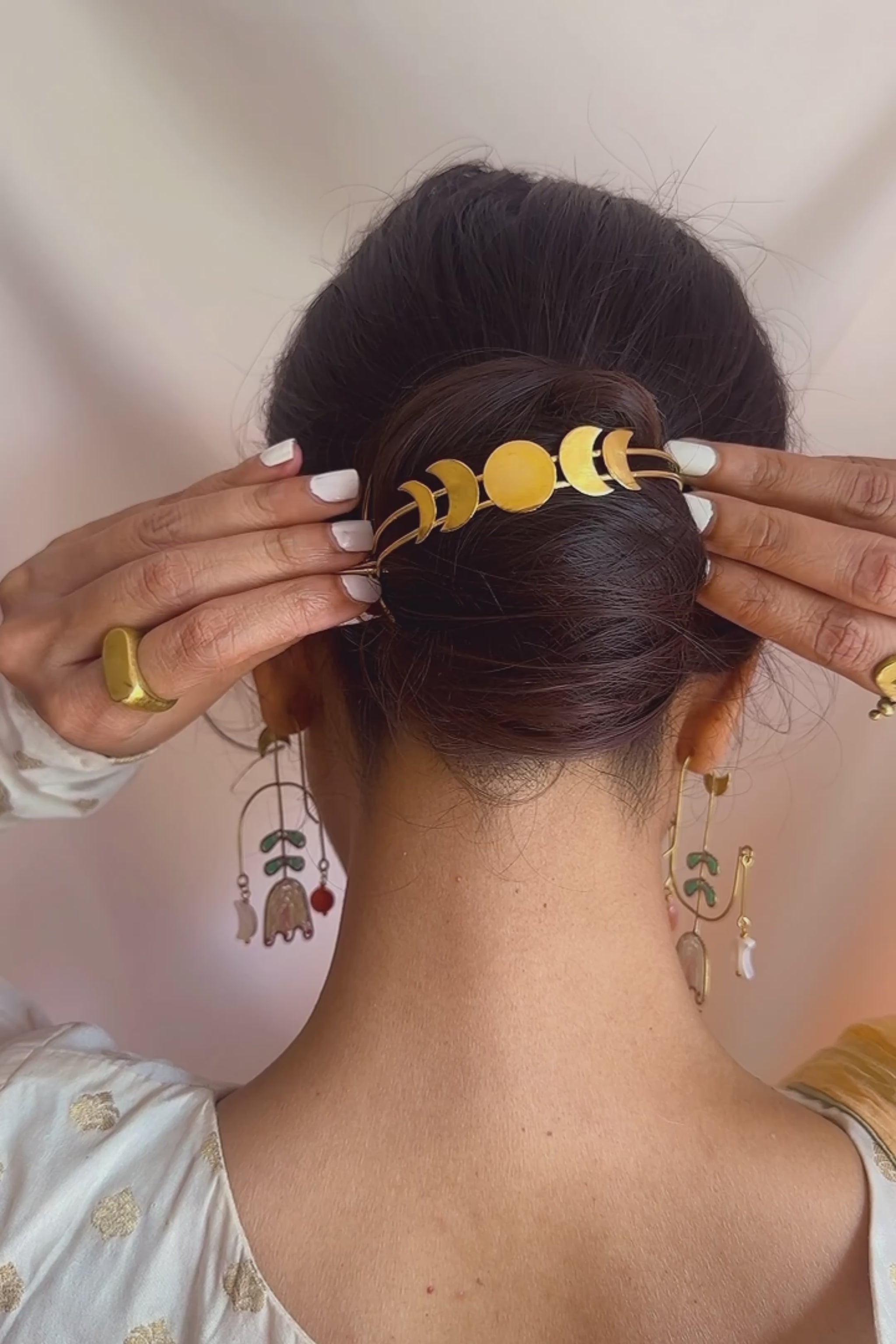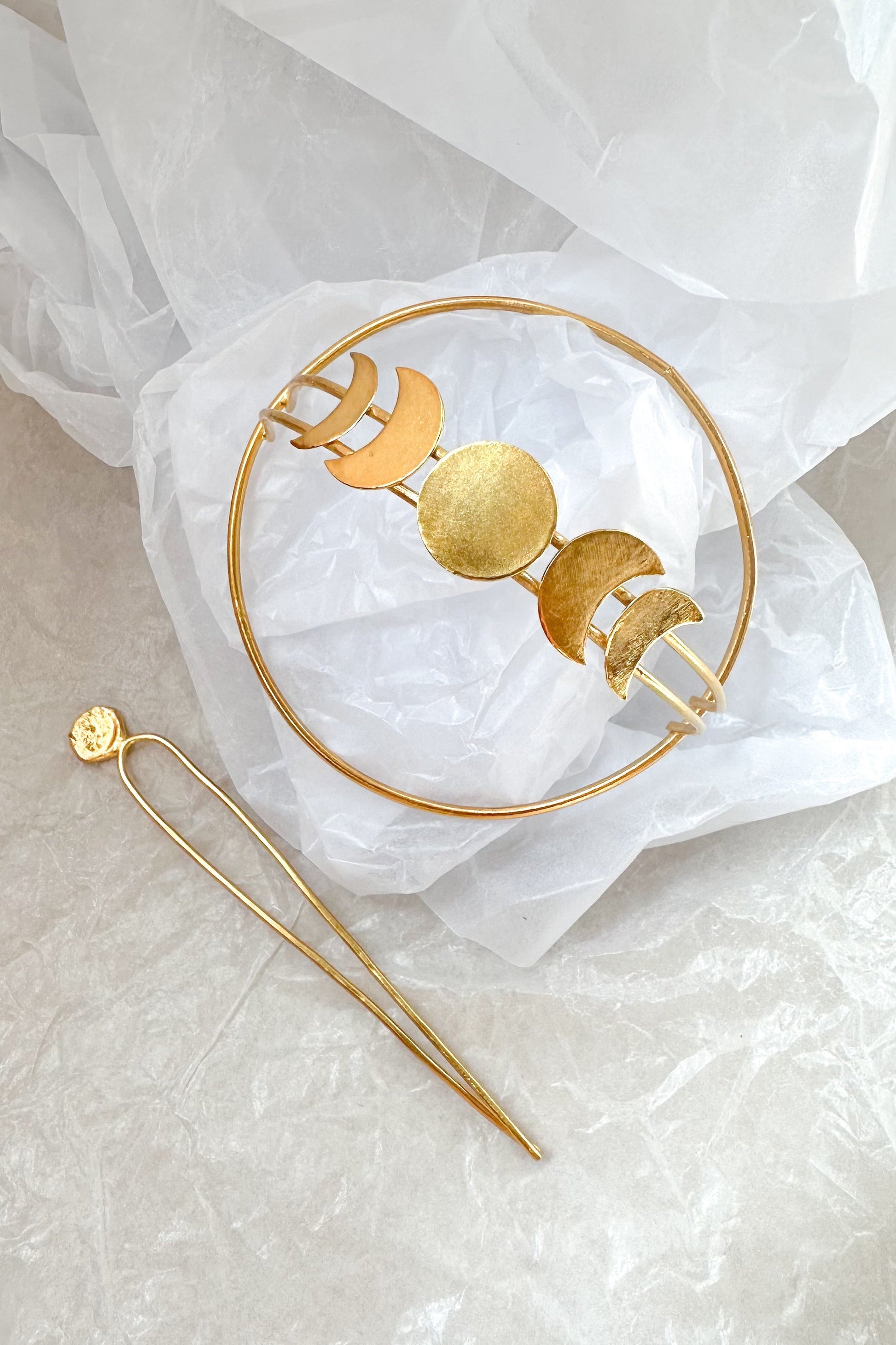 The Moon Phase Bun Cage is a celestial-inspired hair accessory that brings elegance and mystique to your look. Crafted from brass and plated in gold, it features a delicate design that reflects the beauty of the moon's phases, making it a unique addition to your accessory collection.