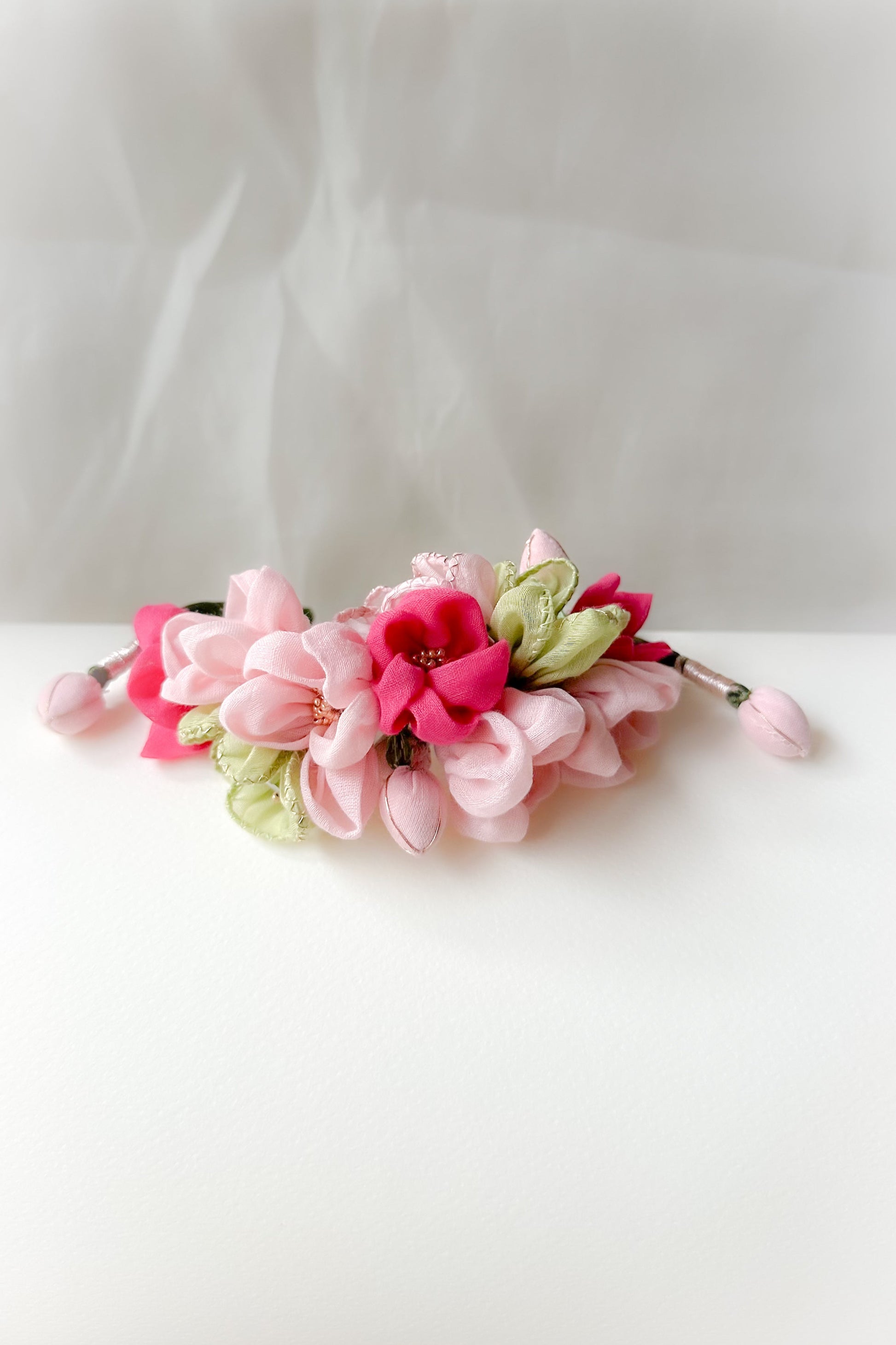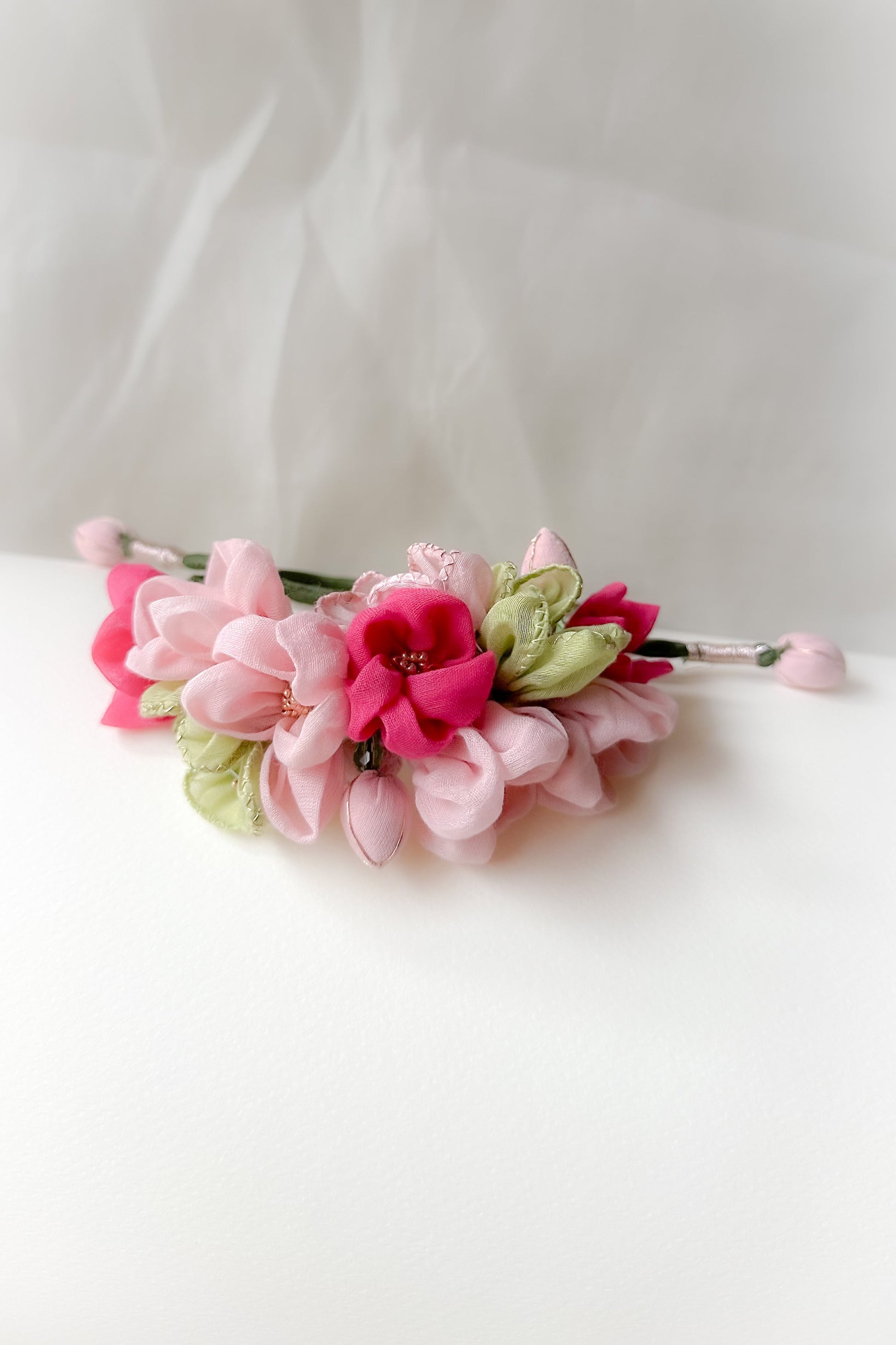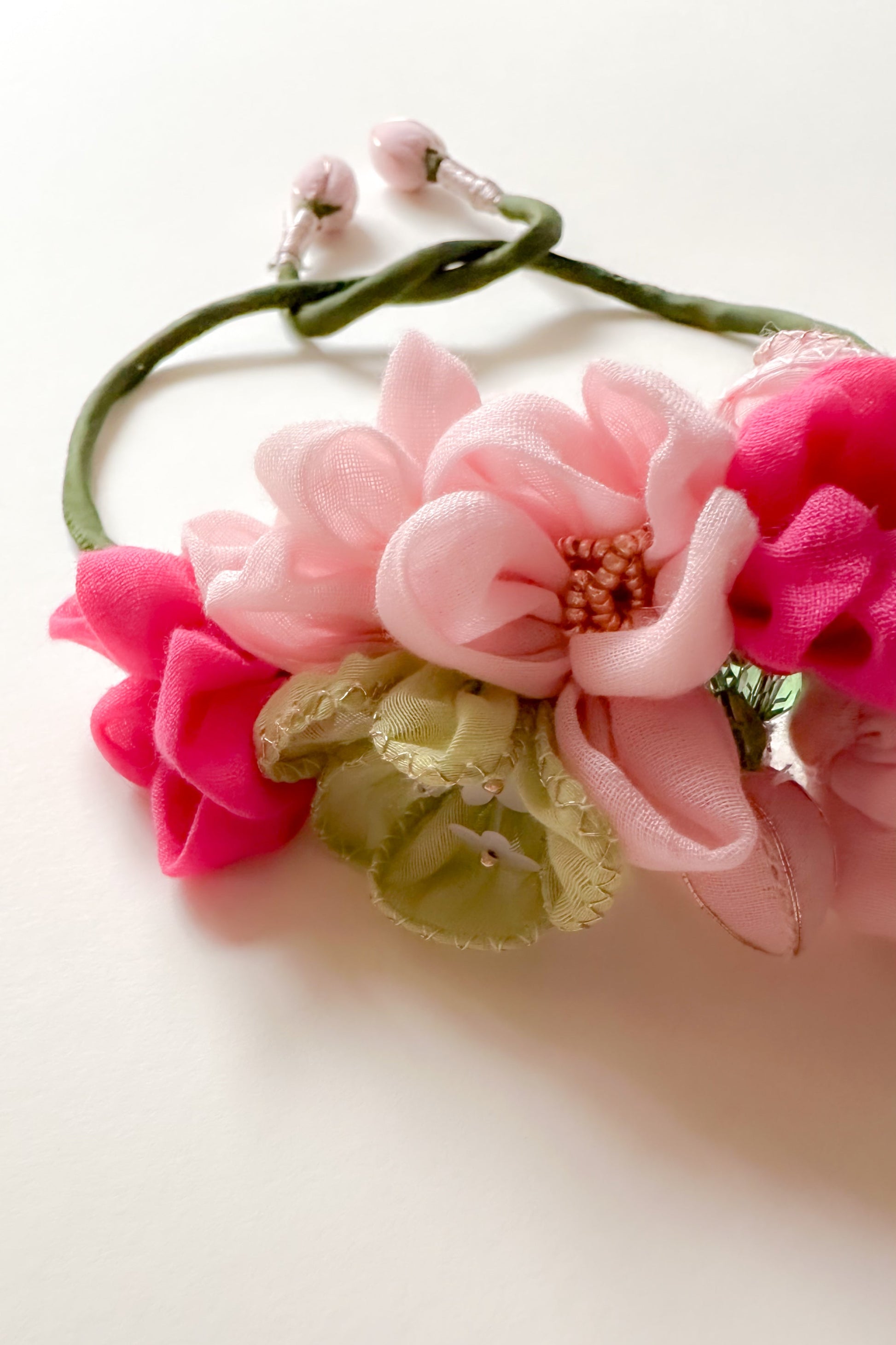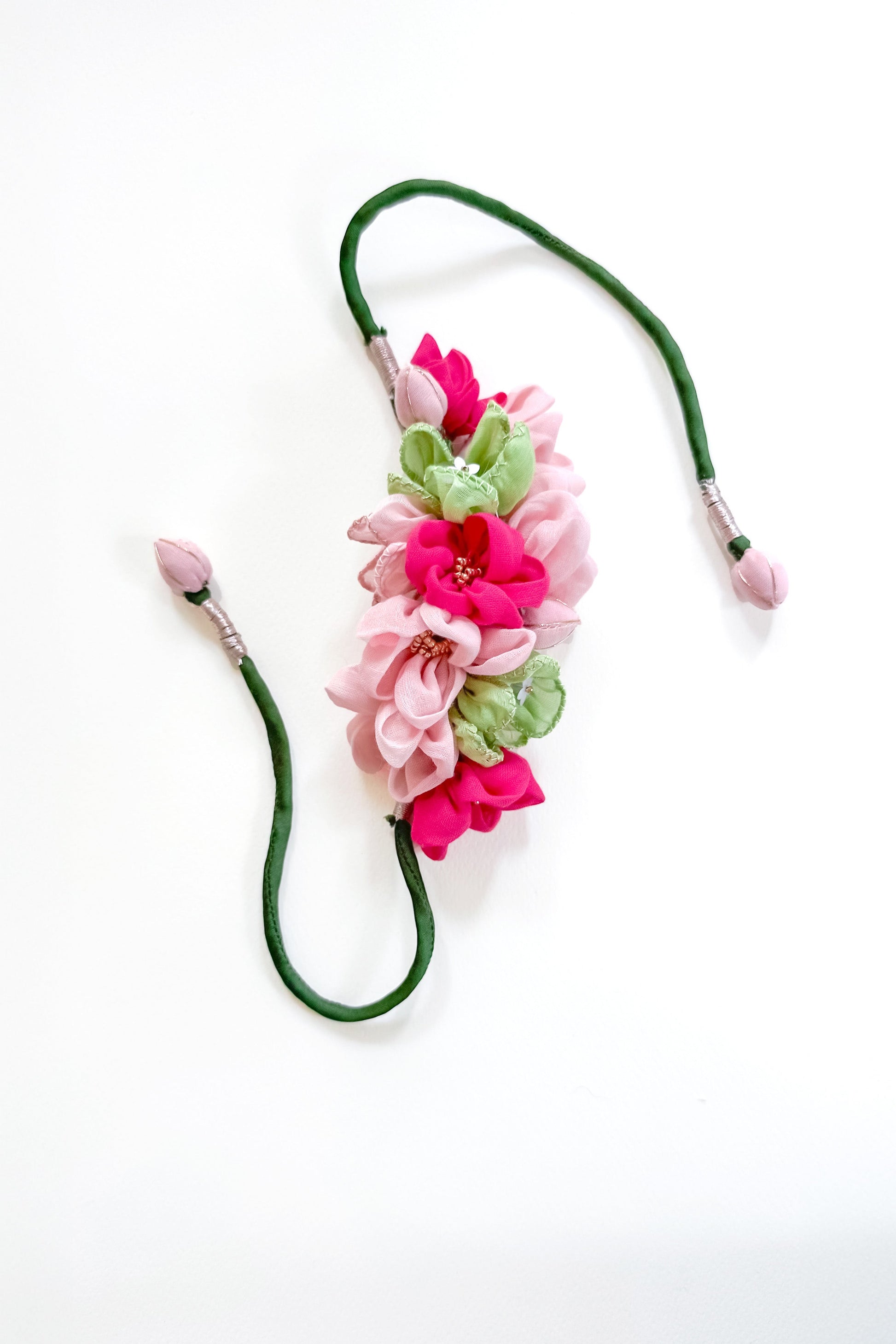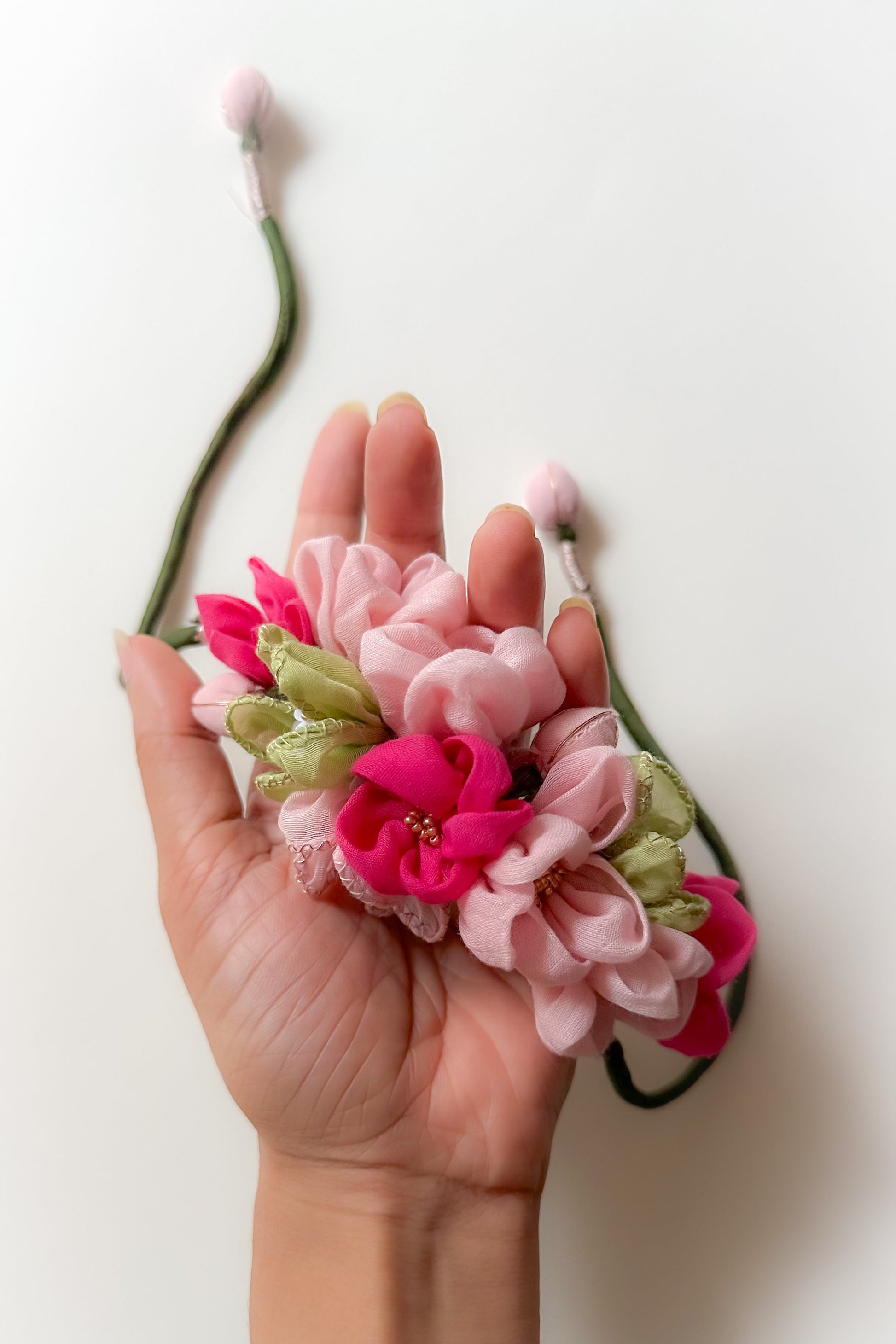 A celebration of colour, craft, and culture—Rangeela Gajra brings playful charm to your festive look. Handcrafted using soft cotton mull and delicate chanderi fabric, it features layers of blooming florals in shades of pink and green, all tied together with a silky satin dori.