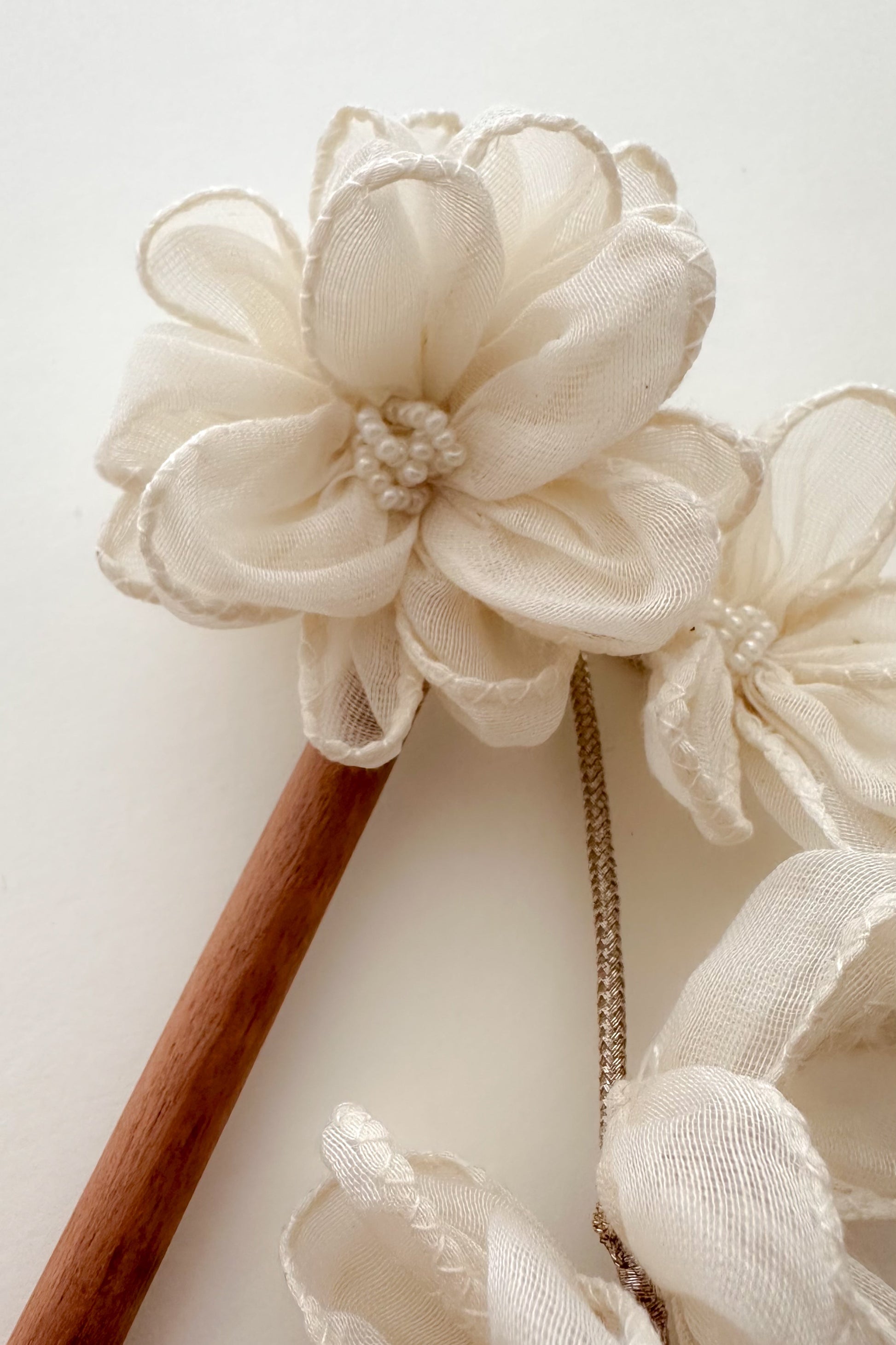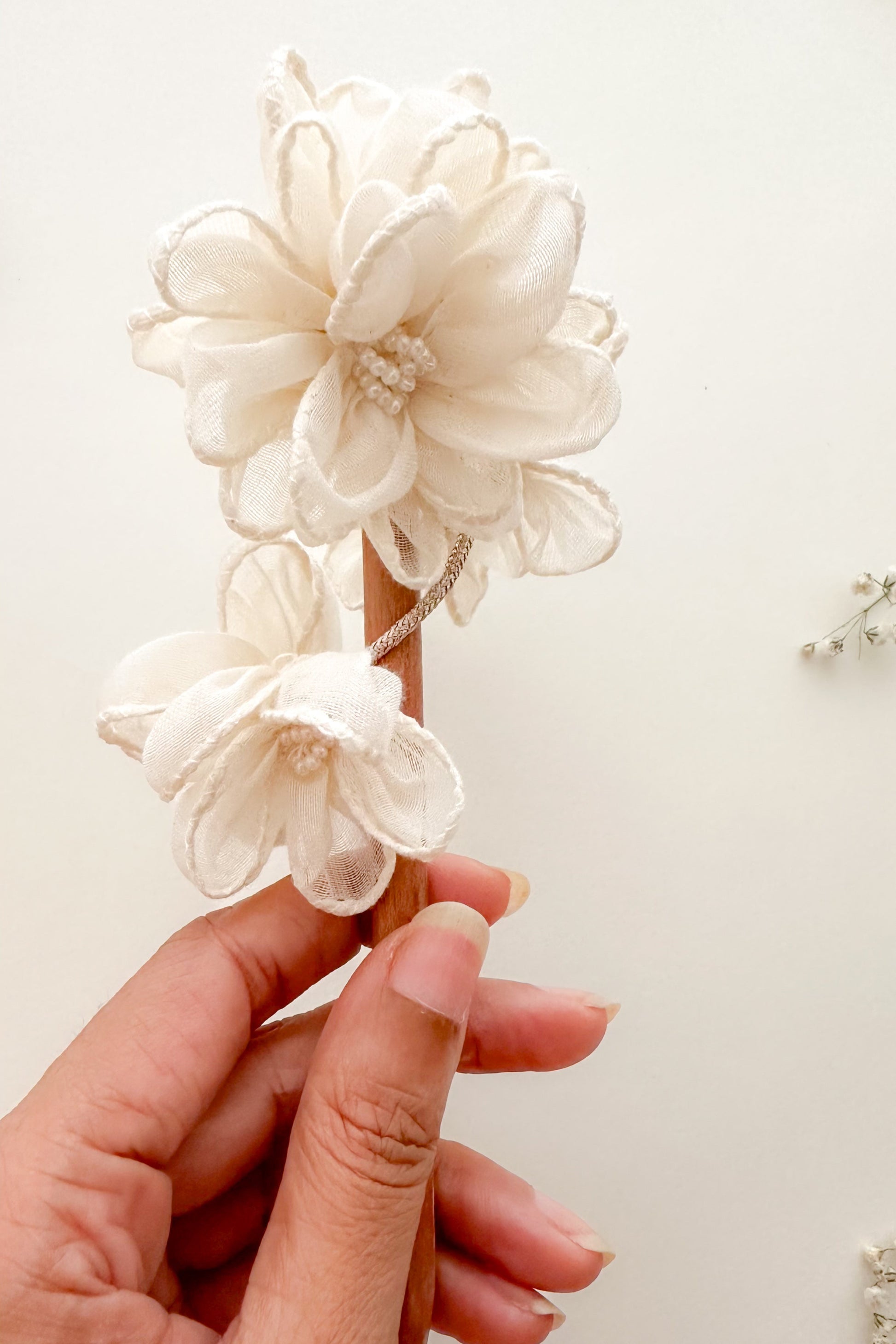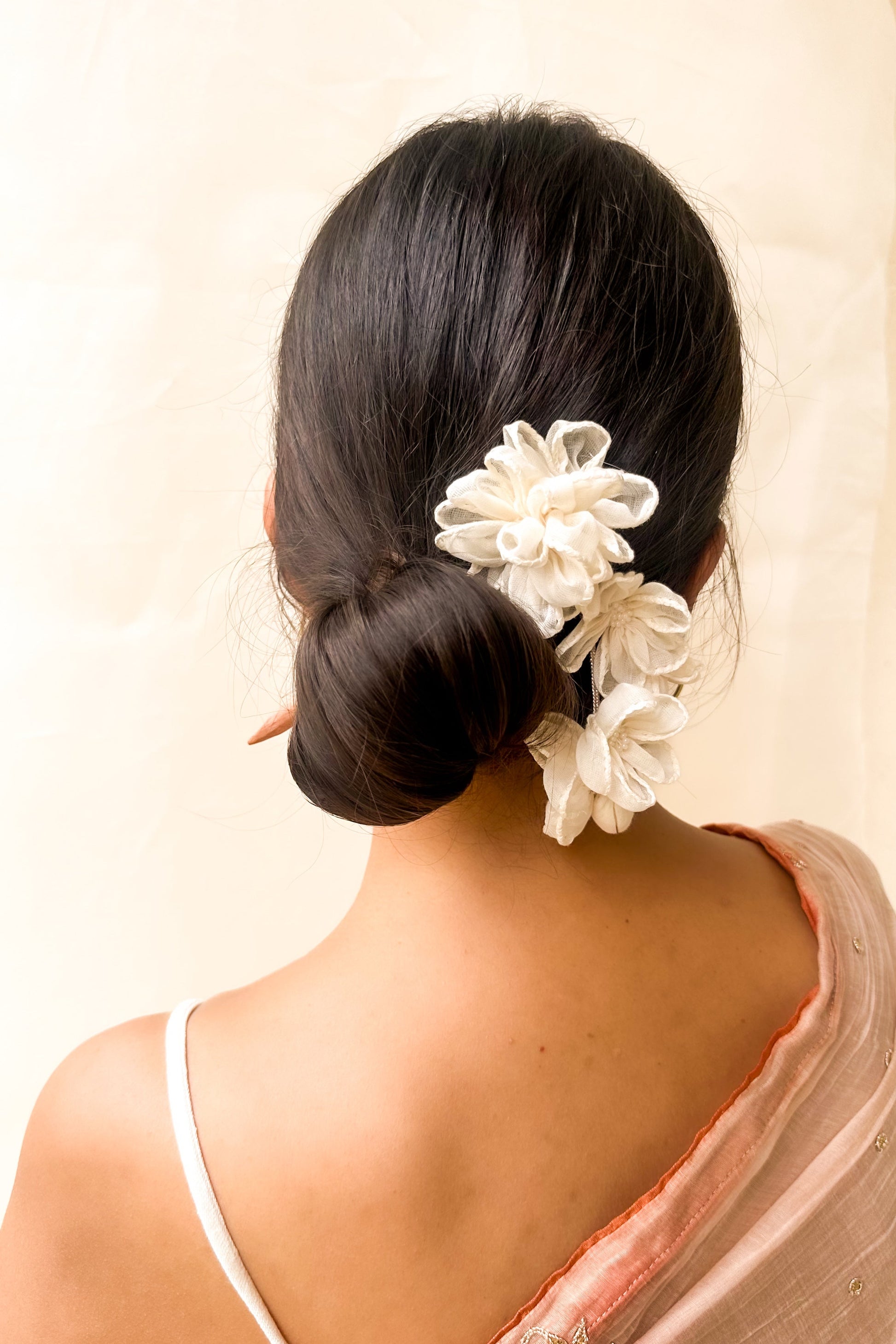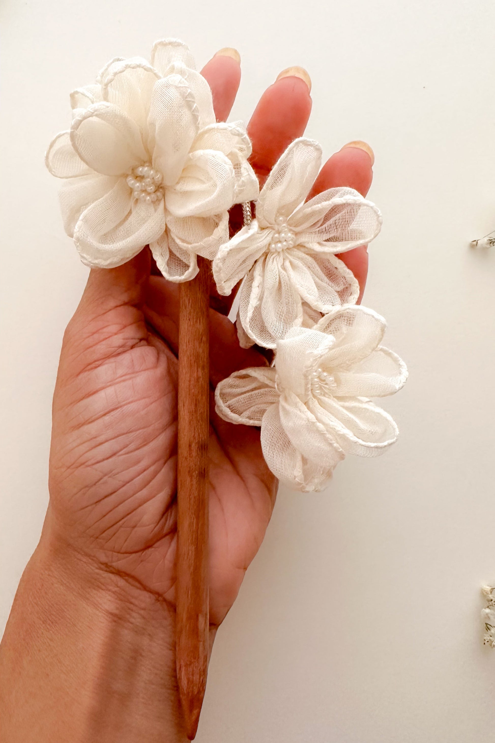 Add a graceful touch to your hair with the Saili Juda Pin, meticulously handmade using soft Chanderi fabric and a natural wooden base. Designed to enhance your bun with floral finesse, each pin carries the charm of artisanal craftsmanship and timeless beauty.